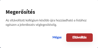 A megjelölés visszavonását (a kollégium elvételét a kiválasztottak közül) a Megjelölés visszavonása linkre felnyíló Megerősítés modalon jóvá kell hagyni az Eltávolítás gombbal.