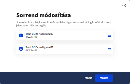 Sorrend módosítása gombbal a kiválasztott kollégiumok közötti prioritási sorrenden lehet változtatni. A megnyíló modalon a kollégium sorát a = jellel megfogva lehet áthúzni a kívánt helyre, majd Mentés gombbal véglegesíthető az új sorrend.