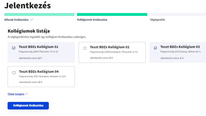 Kollégium hozzáadása gombbal további kollégium adható a jelentkezéshez. A megnyíló felületen a választható kollégiumok listája jelenik meg, az eddig megjelölt kollégiumok már megjelölt állapotban vannak. Jelölhető minden további kollégium, és kivehető a jelölés az eddig választott kollégiumból. Egy kiválasztott kollégium mindenképpen szükséges a tovább lépéshez.