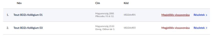 Megjelölés visszavonása linkkel a kiválasztott kollégium törölhető a jelentkezésből.