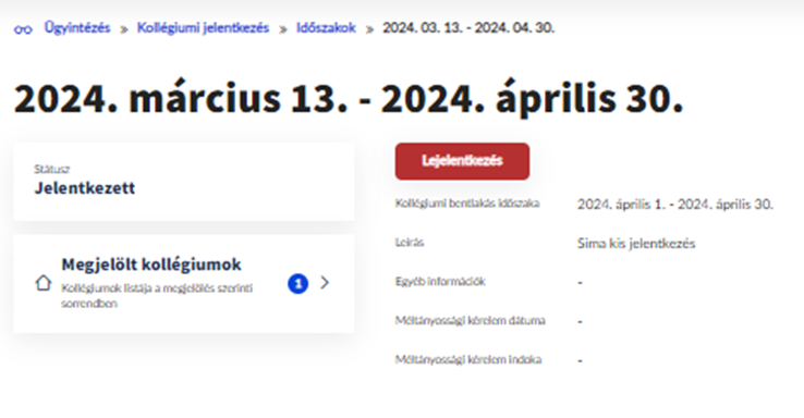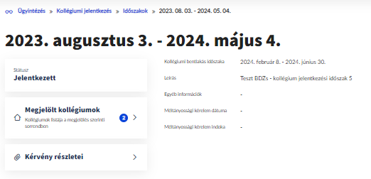 A megnyíló felületen az aktuális kollégiumi jelentkezési időszakok listázódnak, amelyek bentlakás időszaka még nem ért véget. Amely időszakhoz kapcsolódik jelentkezés, az Intervallum oszlopban a jelentkezési időszak intervalluma alatt megjelenik a jelentkezés státusza.