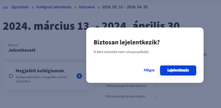 Ha engedélyezett a jelentkezés törlése, az időszakok részletes adatai modalon a Lejelentkezés gombbal lehet visszavonni a jelentkezést.