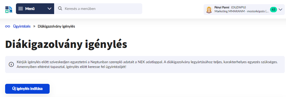Az Új igénylés indítása gombbal nyitható meg az űrlap az igénylés adatainak kitöltéséhez.