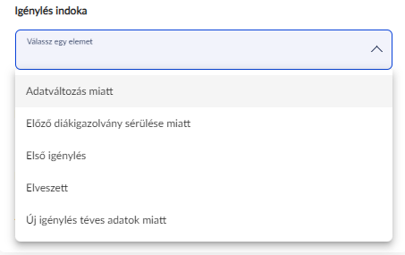 Igénylés indoka mezőbe a nyíllal lehajtható listából a felkínált értékek közül kell a megfelelőt kiválasztani.