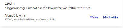 Lakcím mezőbe a Neptunban szereplő állandó lakcím kerül automatikusan. Módosítás linkre kattintva kiválasztható tartózkodási cím is, ha az szerepel a Neptunban.