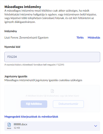 Másodlagos intézményt az Intézmény kiválasztása gombbal megnyitott listából lehet kijelölni. Ha kiválasztunk másik felsőoktatási intézményt, akkor meg kell adni annak nyomdai kódját is. A nyomdai kódot a megjelölt intézmény honlapján általában megtalálható.