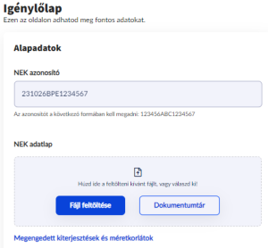 Előfordul, hogy NEK adatlap felirattal Fájl feltöltése és Dokumentumtár gombok is vannak a mező alatt. Ebben az esetben a NEK adatlap elektronikus fájlként feltölthető vagy kötelező feltölteni az igényléshez.