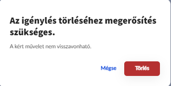 Az Igénylés törlése gombbal az igénylés törlését lehet elvégezni. Mielőtt a törlés megtörténik, megerősítő kérdés érkezik. A felnyíló ablakban a Törlés gombra kattintva végrehajtja a program a törlést.