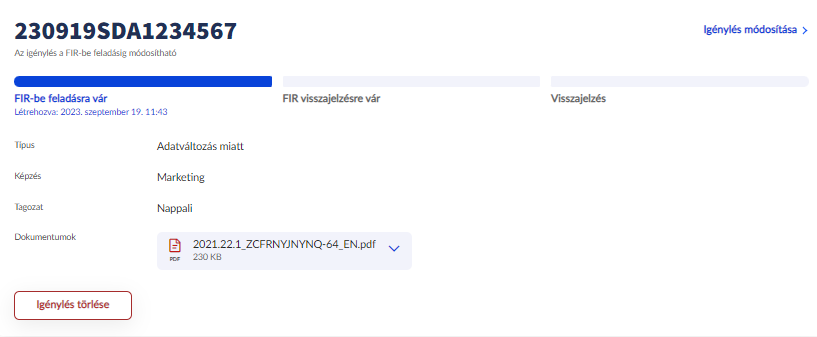 Mindaddig, amíg az igénylést nem továbbították a FIR felé, annak adatai módosíthatók, és az igénylés törölhető is. A mentett igénylés fölötti folyamat visszajelző sávon megtekinthető, hogy milyen állapotban van az igénylés. Amíg csak FIR-be feladásra vár stádiumban van az igénylés, lehetséges a módosítás, törlés.