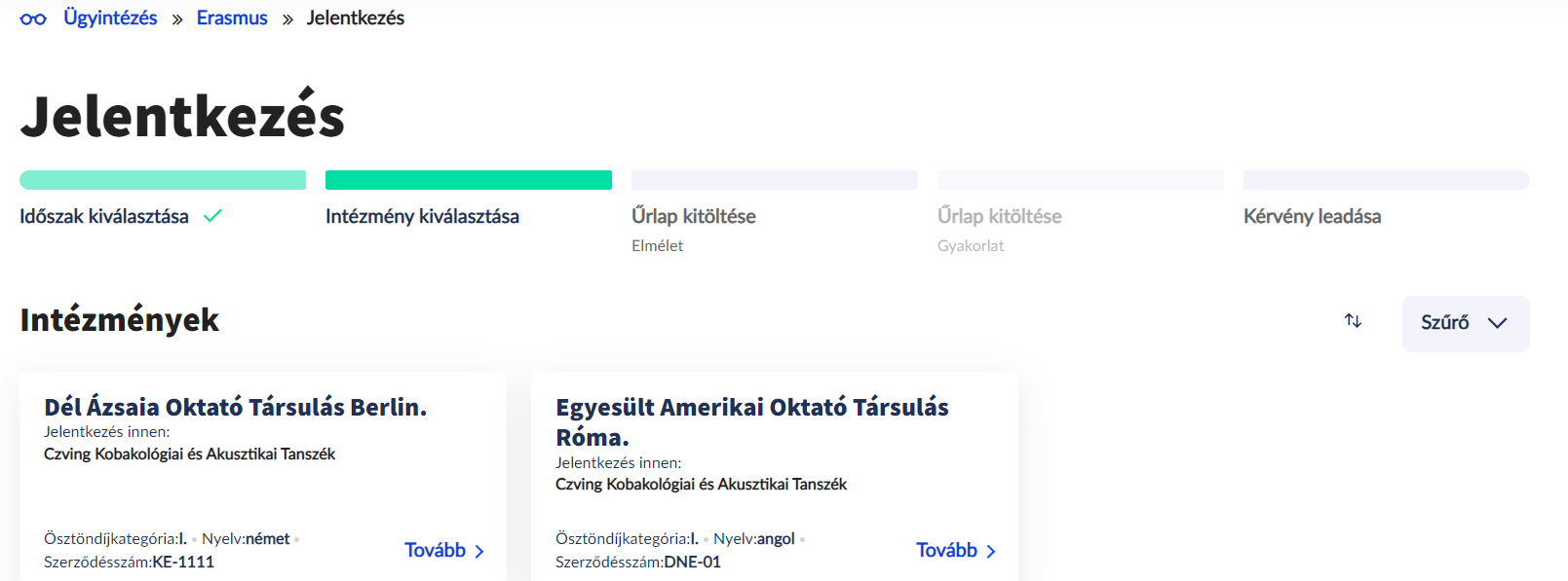 Az Elmélet és gyakorlat típusú jelentkezési lehetőségét választva a felületen megtekinthető, hogy az adott időszakhoz milyen szerződések vannak hozzárendelve, azaz melyik tanszék, milyen külföldi szervezeti egységgel, milyen leírású szerződést kötött.