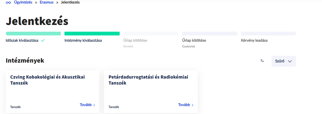 A Gyakorlati jelentkezés lehetőségét választva a felületen megjelenő szervezeti egységek közül lehet választani.