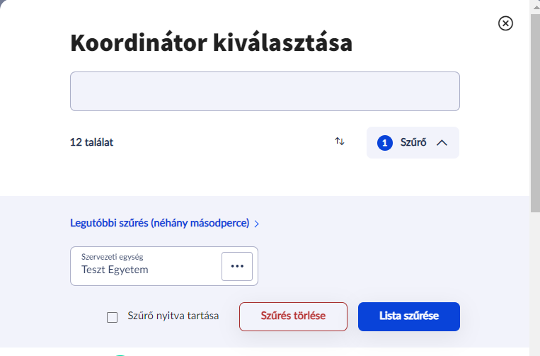 A Szűrés törlése, majd a Lista szűrése gombra kattintva szervezeti egységtől függetlenül, az intézmény összes aktív alkalmazottja közül lehet választani gyakorlati koordinátort.