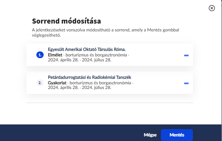 Sikeres jelentkezés esetén egy időszakon belüli jelentkezések a Sorrend módosítása gombra kattintva megjelenő felületen sorrendezhetők.