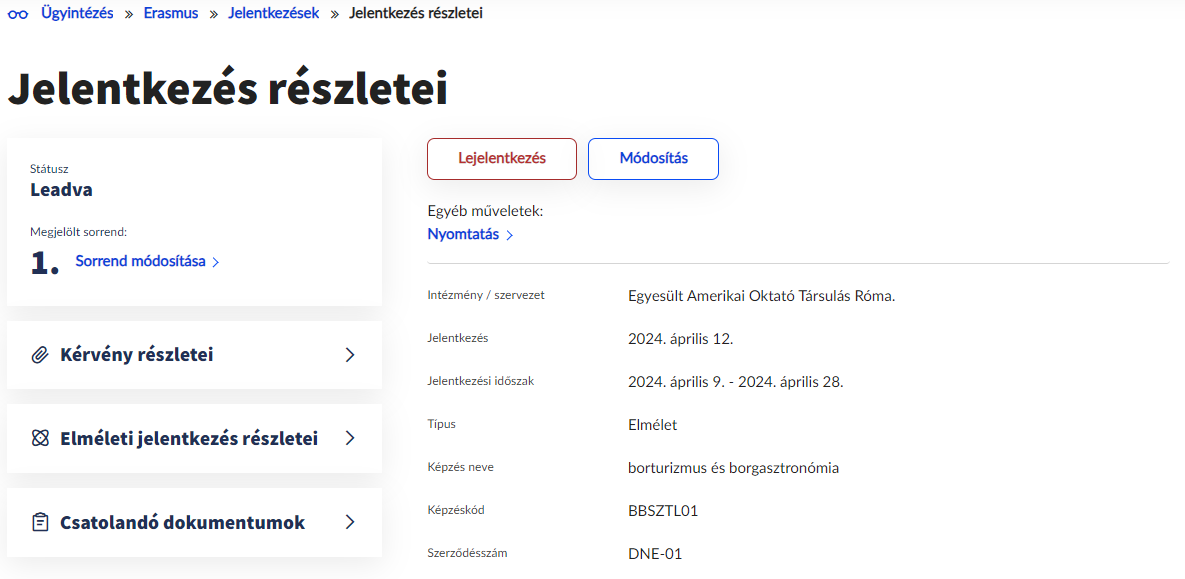 Az Ügyintézés/Erasmus felületen a Jelentkezések megtekintése lehetőséget választva, majd a Jelentkezések felületen a Részletek lehetőségre kattintva a Jelentkezés részletei felületen lehetőség van a már leadott jelentkezéseket módosítani. A felületen Módosítás gombra kattintva elérhető felületen módosíthatja a már leadott jelentkezések adatait.