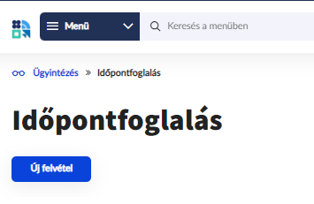 Új időpont foglalását az Ügyintézés/Időpontfoglalás menüponton az Új felvétel gombbal kell kezdeményezni.