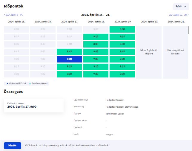 A megfelelő időpontra kattintva választható ki a foglaláshoz az időpont, ami kék színre változik. Ugyanakkor aktívvá válik a Mentés gomb. Mentéssel lefoglalásra kerül az időpont.