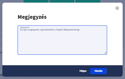 Visszajelző ablakban tájékoztatás érkezik a sikeres foglalásról, és opcionális lehetőségként rögzíthető a foglaláshoz megjegyzés is, melyet utána az ügyintéző is megtekinthet.