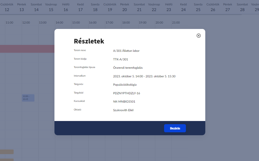 A teremórarendben megjelenő elemekre kattintva megtekinthetők az adott foglalás részletei: