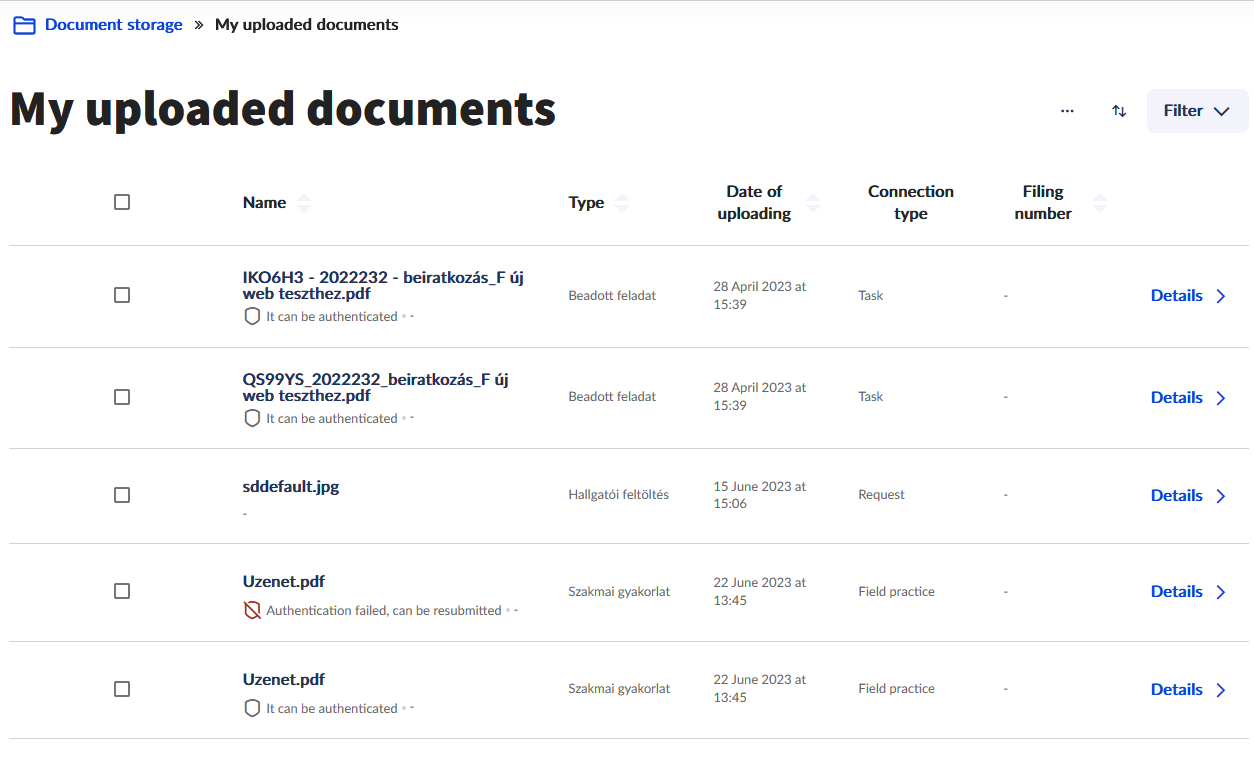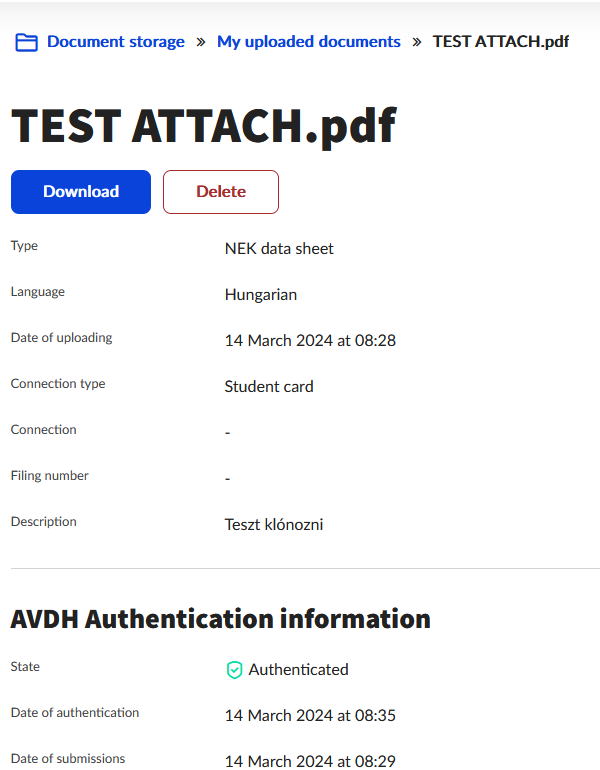 After pressing the Authentication button, the system redirects the user to the login screen of the Customer Portal, where after successfully logging in the authentication of the document automatically takes place, and the system redirects the user to the Document Storage/My uploaded documents/Details screen without any further action. If a login or other error on the AVDH site occurs, the system does not redirect the user to the Student Web Interface, and the user is informed in detail of what caused the error on the login or AVDH screen of the Customer Portal.
