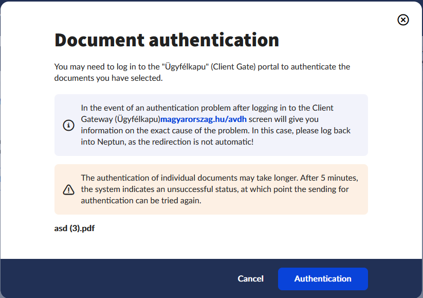 After selection and pressing the Authentication button, detailed information about the authentication process can be read, and the documents selected for authentication can be viewed in the Document authentication popup window. The selected documents that cannot be authenticated are displayed in a separate section in the popup window. The selection can be modified. After finalizing the selection, the process continues after pressing the Authentication button in the popup window.