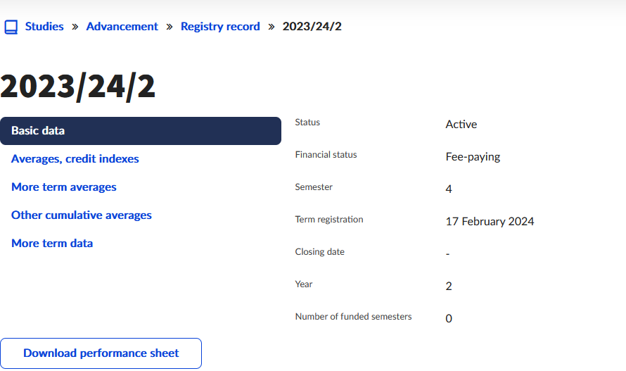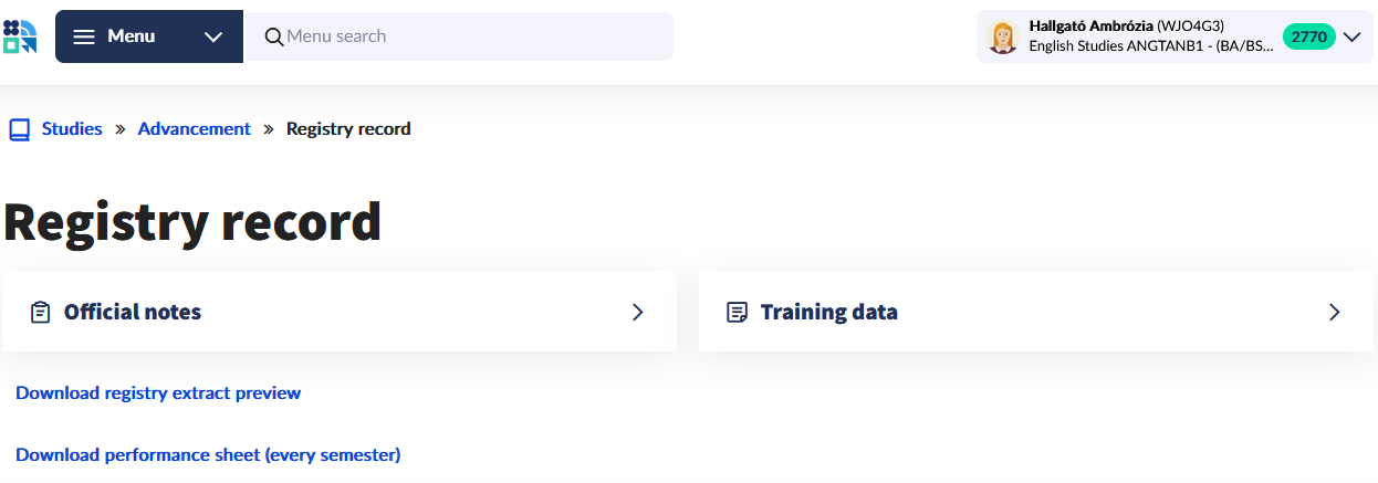 On the the Studies/Advancement/Registry record screen the Performance sheet (every semester) document can be downloaded, which contains the data of the subjects of all the semesters of the studies: name and code of subject, credit, grade. It may contain further data too if the institute increases the range of data that can be displayed in the template.