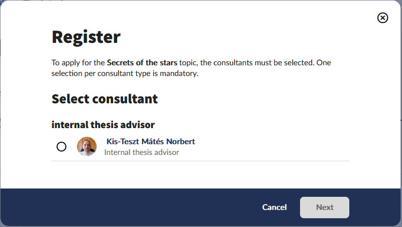 If the institutional settings allow, the Select consultant window appears by clicking the Registration button, where the selectable lecturers assigned for the thesis topic are grouped by evaluator type in blocks. One lecturer per evaluator type can be selected, which is mandatory to continue. The thus selected lecturer is assigned to the topic registration row created with the registration.