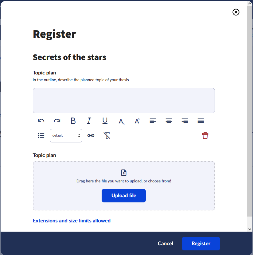 If the institutional settings allow, the window where the title and the thesis outline can be provided appears by clicking the Registration button (if a consultant can be selected, after the Select consultant window). Here the title of the thesis can be provided as well as the description of the thesis outline required for registration. A file of thesis outline can also be attached.