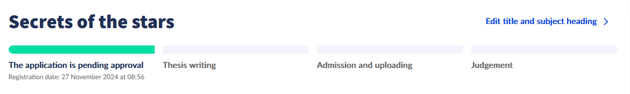 After the successful registration, the student can view his or her registrations on the Degree thesis screen, where the status becomes The application is pending approval.